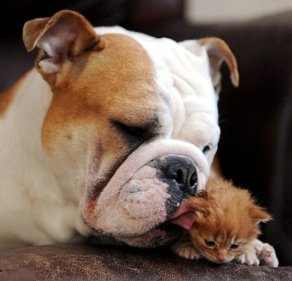 Bulldog dal muso imbronciato adotta un piccolo gattino
