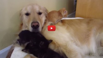 Cane si prende cura di tre gattini [VIDEO]