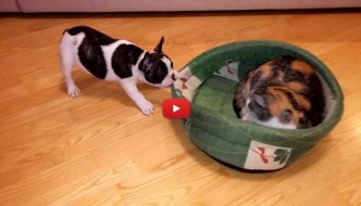 Gatto ruba il letto a un cucciolo di cane! [VIDEO]